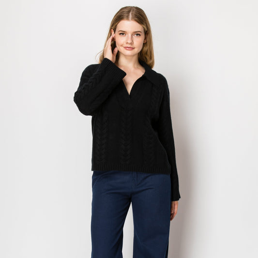 Dean Cashmere Cable Knit Polo Pullover In Black