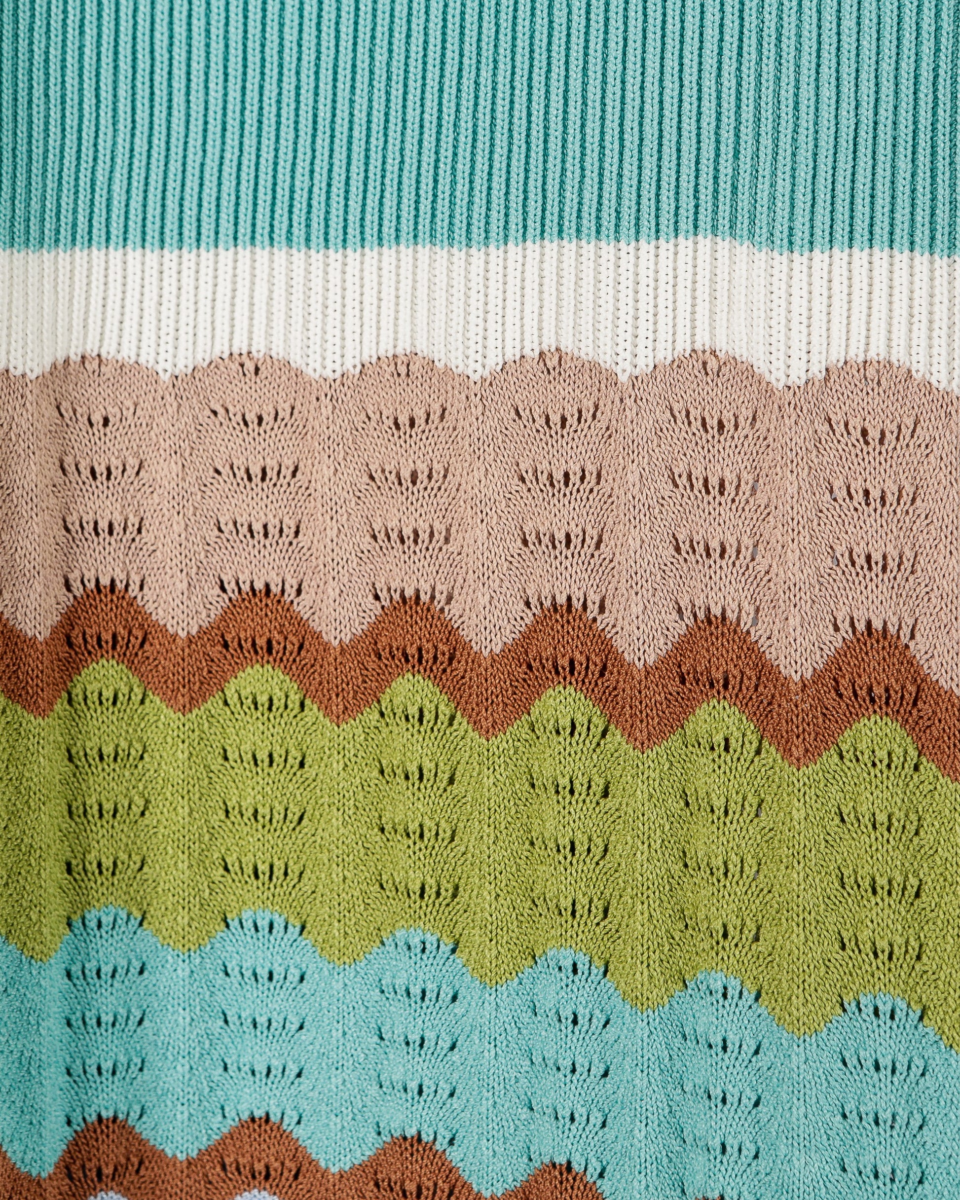 Make a bold and playful statement in this women's Eyelet Crochet Midi Dress, crafted from a vibrant multicolor wave crochet knit with a hint of stretch for effortless comfort. Featuring a stunning palette of earthy neutrals, ocean blues, and pops of citrus, this dress perfectly blends retro charm with modern flair.