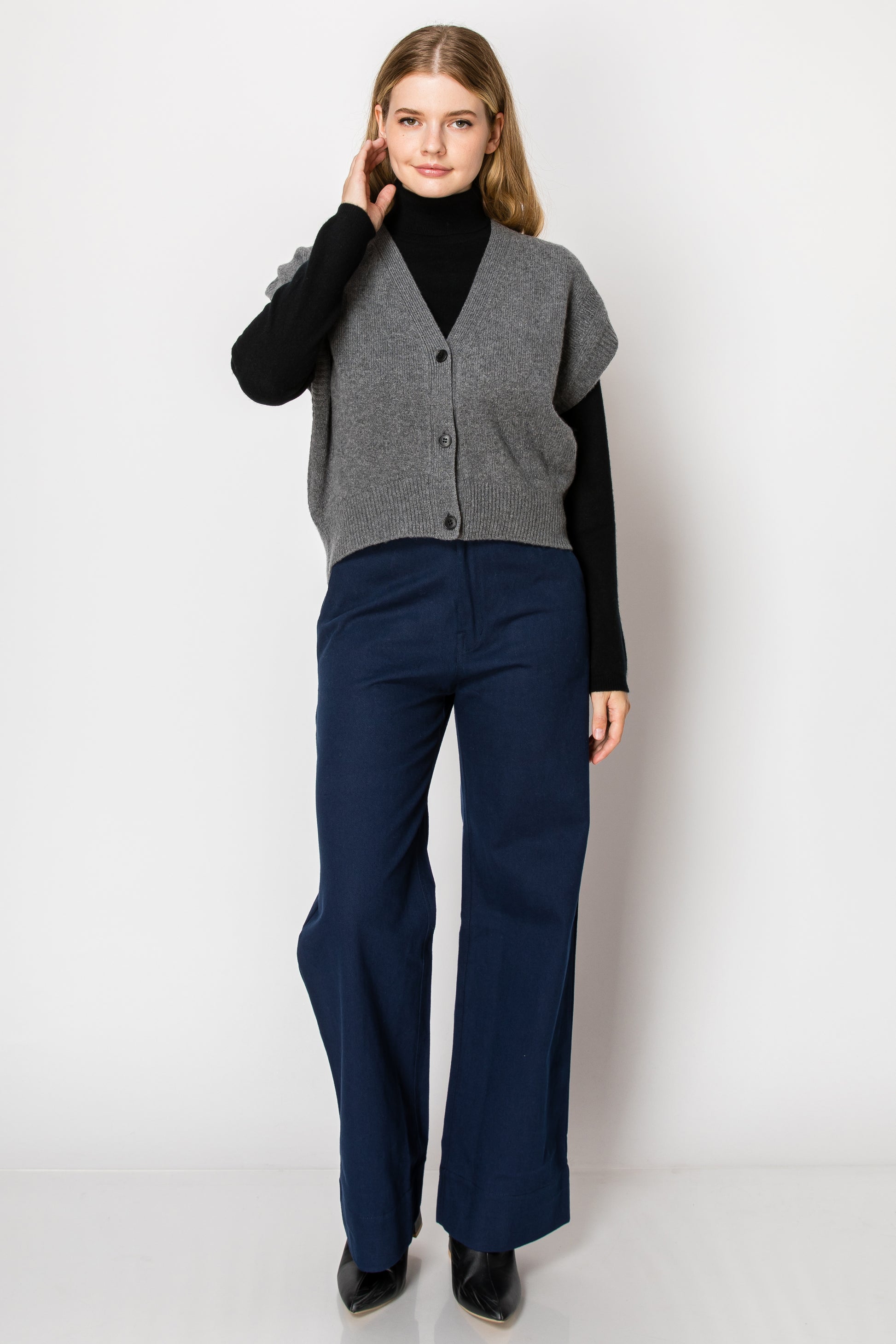 This knit vest is a versatile must-have for creating stylish layered outfits. The intricate change in knit pattern adds a captivating accent to the otherwise simple design.